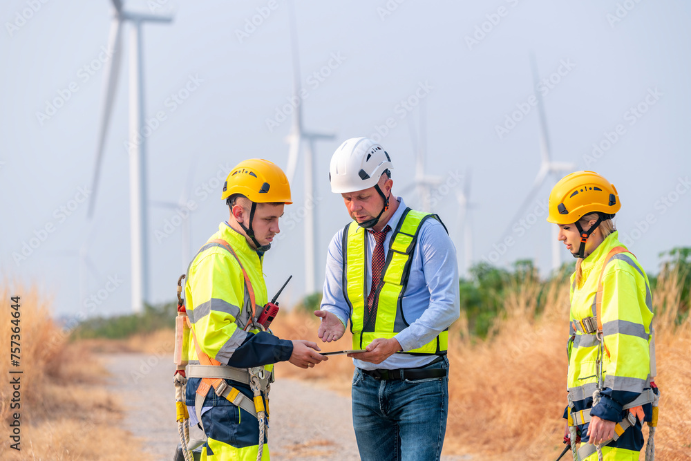 Engineer surveyor and manager wearing uniform walking holding box inspection and tablet work in wind turbine farms rotation to electricity, alternative renewable energy for clean power energy concept.