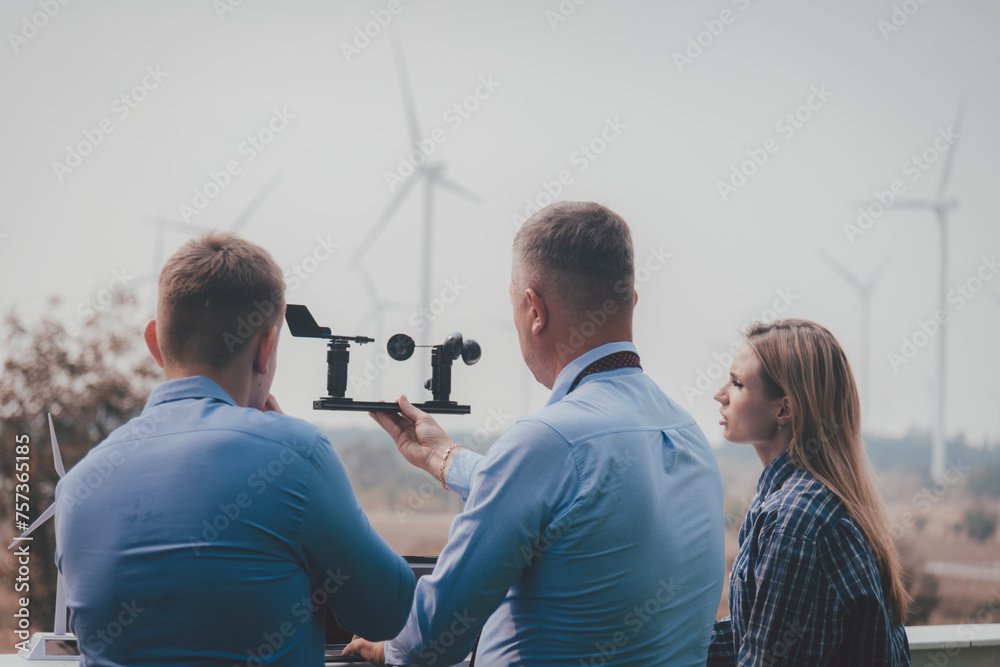Engineers turbine windmill work in turbine farms rotation resource from windmill turbine model and meteorological collect data to measure the wind force meter is ecology energy concept.