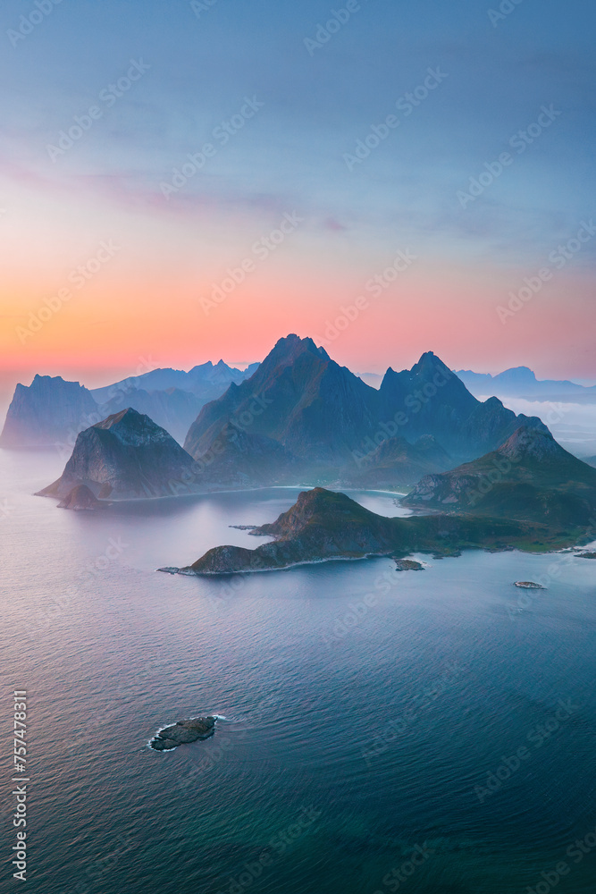 Lofoten islands in Norway sunset landscape rocks and sea travel destinations scenery northern scandinavian nature midnight sun summer season natural landmarks