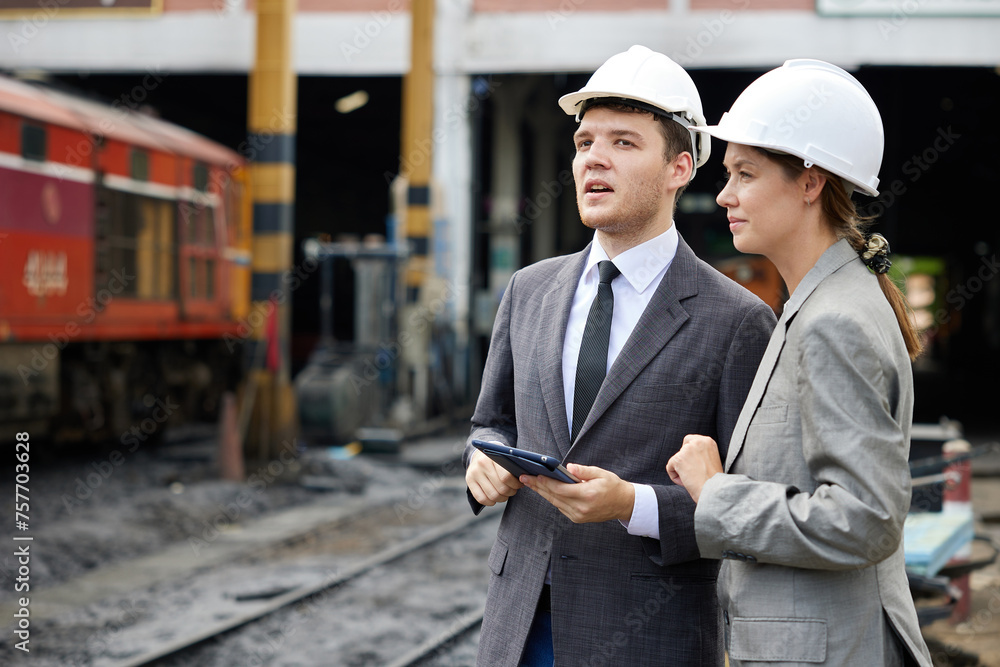 businesspeople talking and checking train on construction site