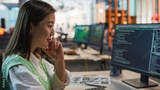Female Asian Game Programmer Coding On Desktop Computer In Game Development Studio Diverse Office. Focused Woman Writes Lines Of Code, Does AI Engineering For New Immersive 3D Survival Video Game