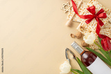 Elegant Seder table theme, top view. Features matzah encircled by ribbon, wine bottle, walnuts, honey spoon, nutcracker, star of David and tulips on a light beige surface, space for wording