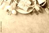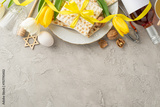 Refined Passover table setup captured from top view, featuring ribbon-tied matzah, red wine and glass, nuts, boiled egg, star of David, nutcracker, tulips on sleek grey backdrop, leaving space for ad