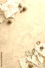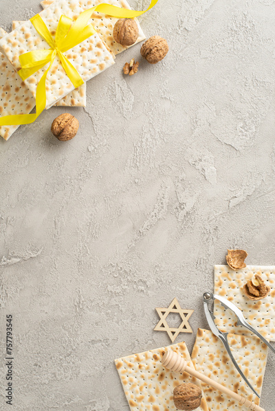 Exquisite Passover vertical tableau from top view, presenting ribbon-wrapped matzah, walnuts, honey spoon, star of David, and nutcracker poised on a grey concrete canvas, with an area for text