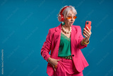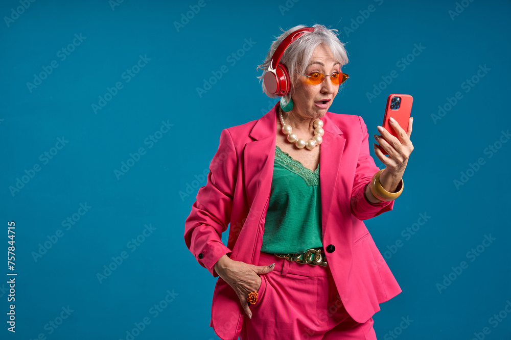 Surprised Stylish Senior Woman with Headphones Using Smartphone