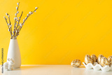 Bright Easter kitchen setup, featuring side view table with stylish ceramic pot for luxurious golden eggs, bunny figure, and pussy-willow in vase, set against lively yellow wall, perfect for messages