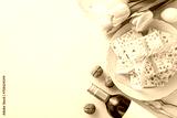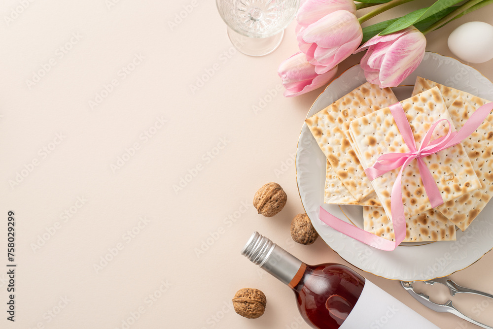 Seder celebration essentials: From top view, matzah wrapped in a ribbon, a red wine bottle, goblet, nuts, nutcracker, an egg, and tulips on a pastel beige ground, with a spot for text