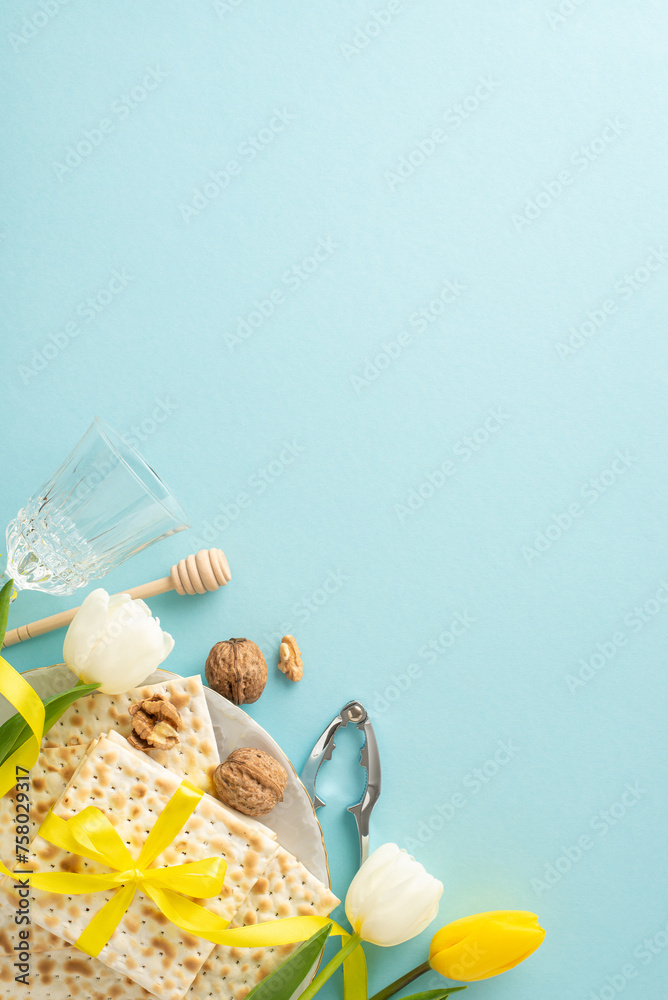 Elegant Passover theme, top view vertical image of ribbon-bound matza, goblet, nuts, honey dipper, nutcracker, and tulips on a gentle blue background, space for copy