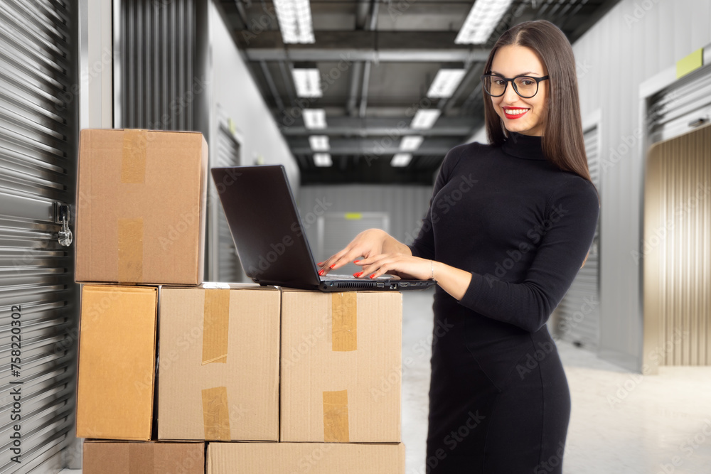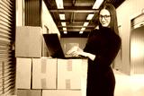 Businesswoman in Warehouse Checking Inventory on Laptop