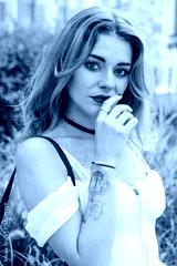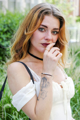 beautiful blonde girl, with a white dress, gothic style, outdoors in a European city. Green hedges background. Holidays in Milan, Italy.