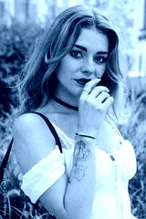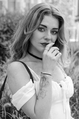 beautiful blonde girl, with a white dress, gothic style, outdoors in a European city. Green hedges background. Holidays in Milan, Italy. Black % White