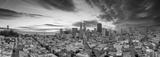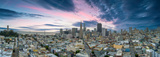 panoramic aerial shot of the ocean and streets lined with apartments, lush green trees and Coit Tower with powerful clouds at sunset in San Francisco California USA