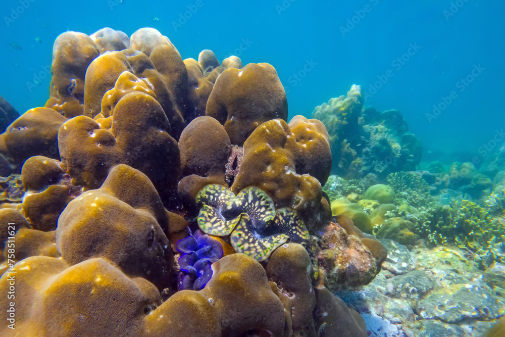 Many blue brown colorful tridacna clams with beautiful petal patterns and sea urchins on the coral reef underwater tropical exotic world.