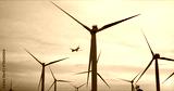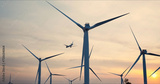 Large wind turbine rotating blades of in field against background of orange sunset on horizon with bright disk sun . Large passenger airplane, airliner landing at the airport runway.