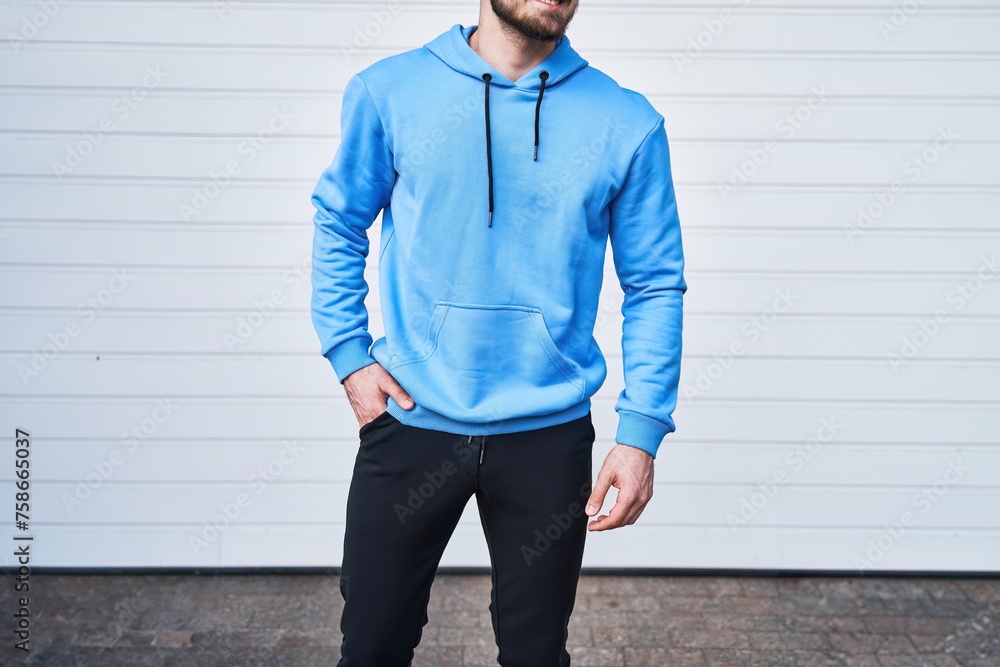 mockup shows a stylish man wearing a blue hoodie and leaning on a white wall. It is perfect for showcasing your logo and brand swag ideas