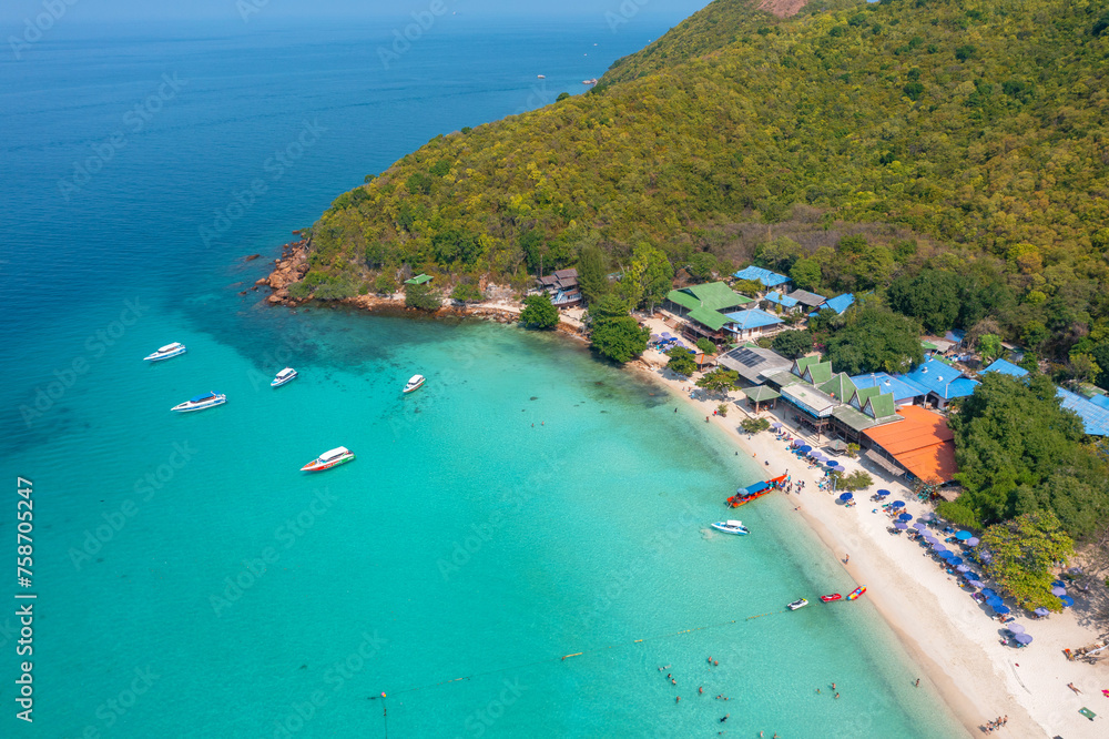 Aerial top view colorful umbrellas on sandy beach, swimming people blue sea summer sunny morning. Resort tropical seascape turquoise water, travel vacation pier, hoverboards, ships speed boats.