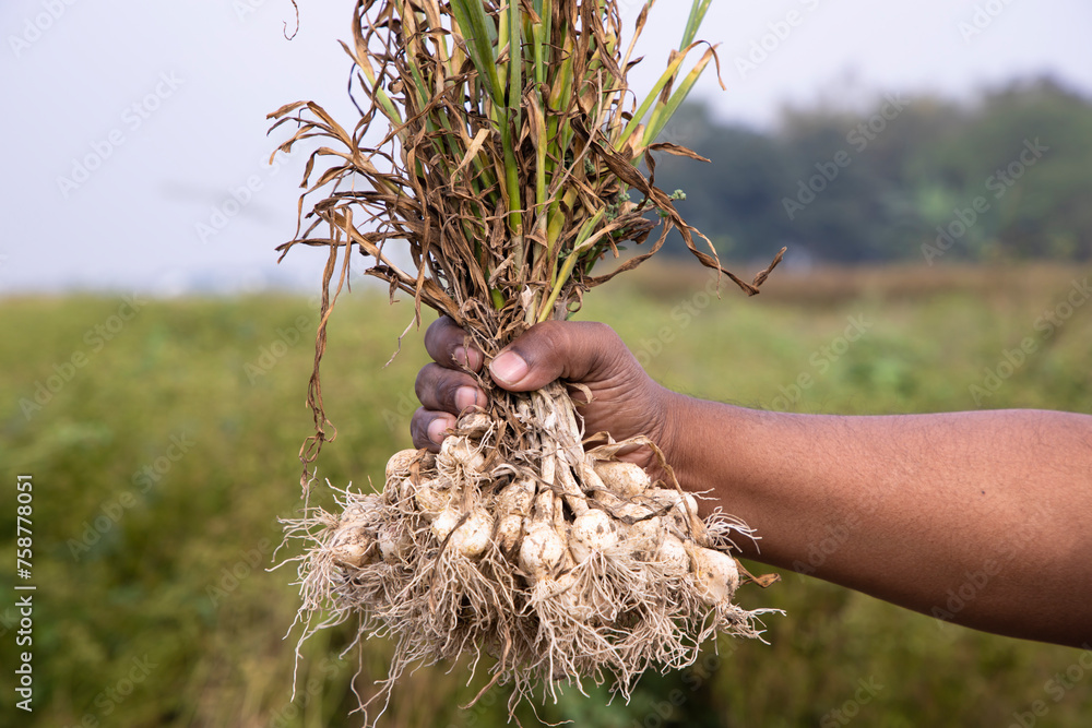 Farmer Hand holding a bunch of fresh garlic, harvesting season in the field
