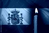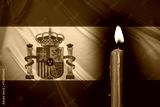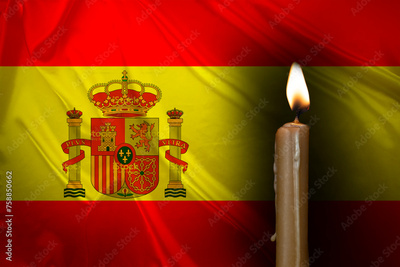 mourning candle burning front of flag Spain, Victims of cataclysm or war concept, memory of heroes served country, grief over loss, national unity in challenging times, state's history