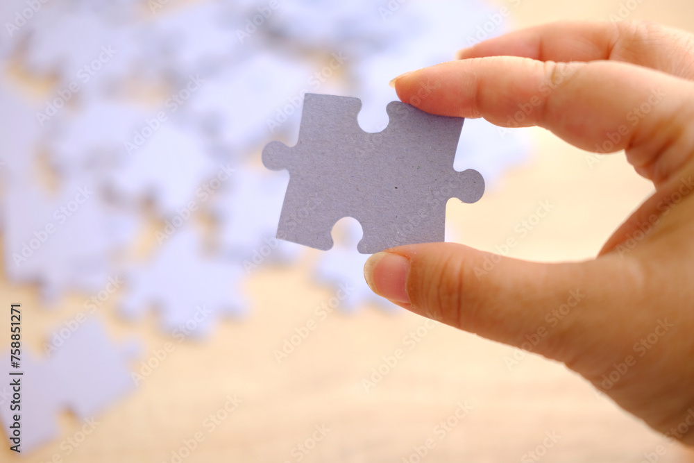 cardboard puzzle piece in female hand, concept puzzle assembly on psychological well-being, relaxation and mood enhancement