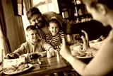 Happy family having fun while being photographed during breakfast in hotel restaurant.