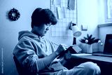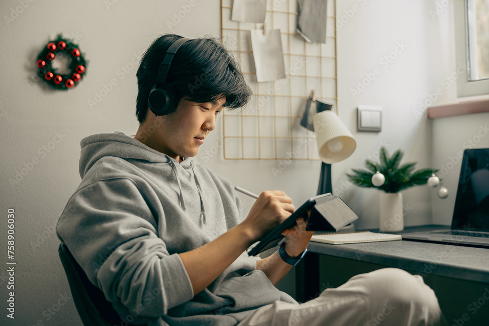 Focused male graphic designer in headphones use digital tablet for working from home office