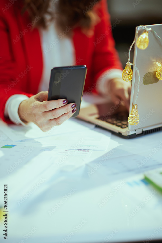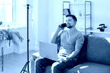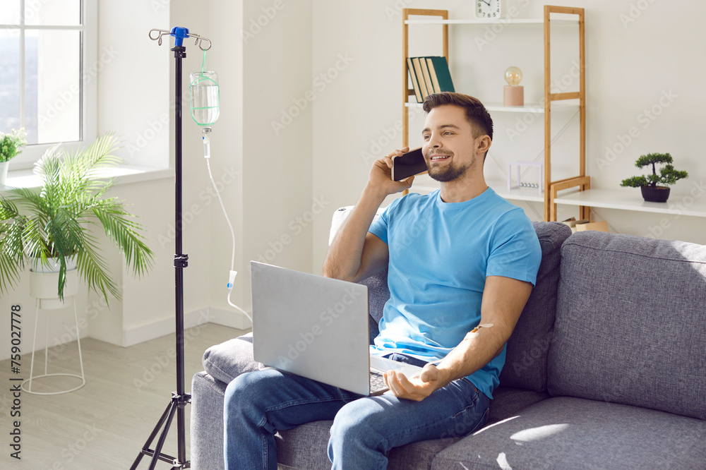 Young man receiving intravenous vitamin therapy while talking on phone. Cheerful businessman in casual clothes sitting on sofa attached to vitamin IV infusion drip and using laptop computer