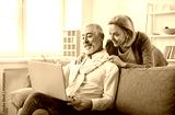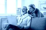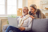 Happy senior couple video call speaking online, older adults with laptop, successful video-conference communication, nice happy elderly people, old pair family at home together virtual family meeting