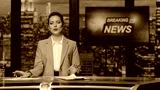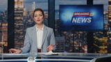 Woman host presenting newscast standing tv stage near screen. Lady breaking news