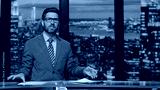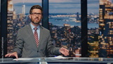 Anchorman ending tv news evening program closeup. Presenter talking television
