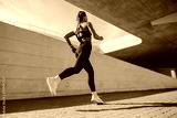 Back view of woman athlete in sportswear is running on buildings background. Active life concept