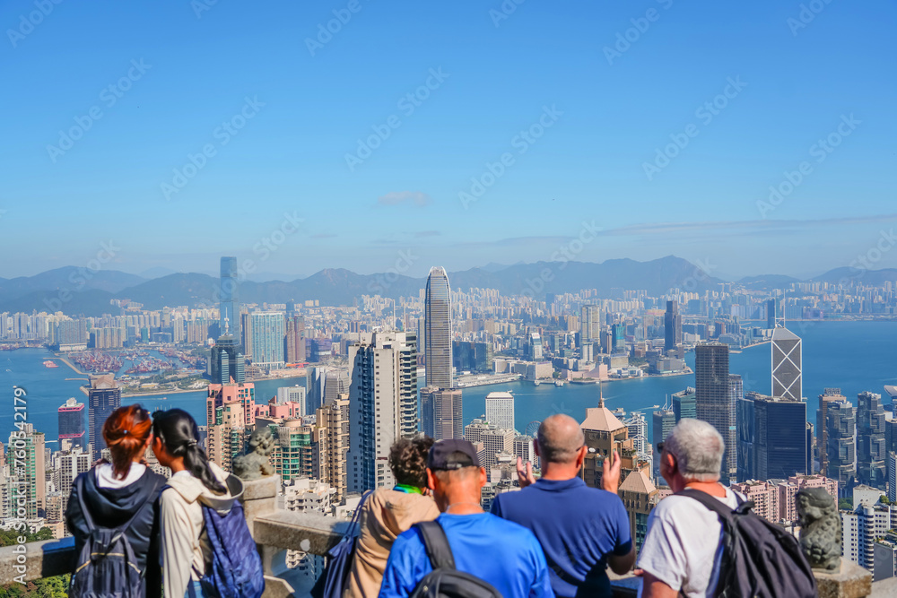 Panoramic of Hong Kong city view from Victoria Peak with a crowd of people, spectators, tourists, modern cityscape morning sunny day clouds.
