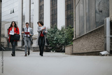 A group of lawyers in formal attire walking outside office buildings, engaged in a discussion.