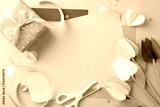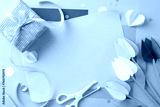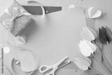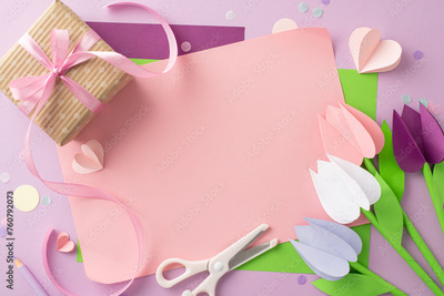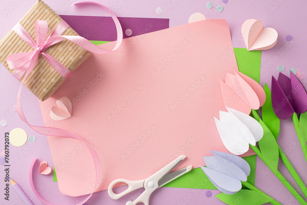 Special Mother's Day creation: top view snapshot of folded origami tulips, present tied with ribbon, scissors, color paper for handicraft, heart shapes, and confetti on a lilac surface, slot for copy