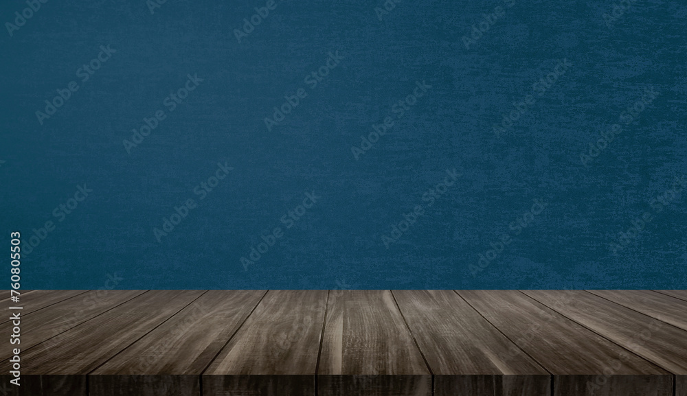 empty wood table at foreground with blue color fabric wallpaper at background for product placement displayed. empty brown grey wooden deck table with blue background for luxury concept.