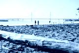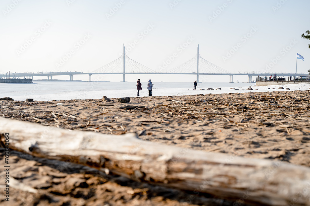 People walk on the ice of the river. Saint Petersburg, Russia - 7 March 2024
