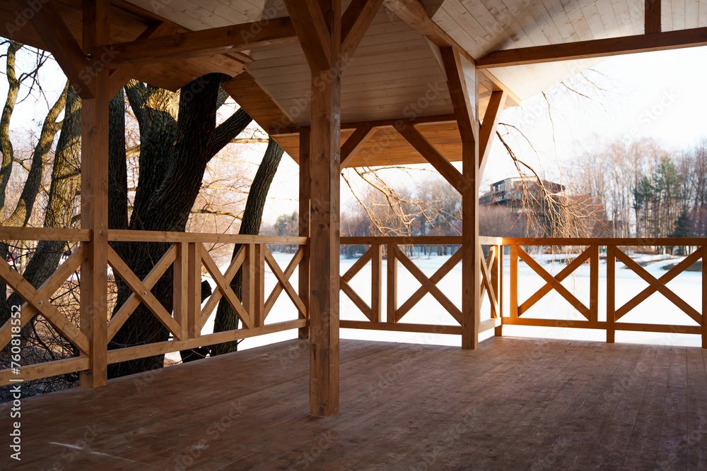 Wooden gazebo with a fence in the park in spring