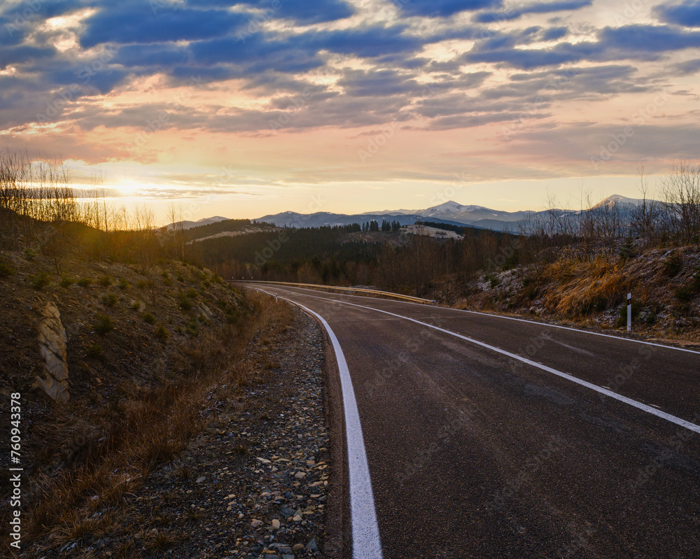 Asphalt road curve and autumn sunset Mountains, Ukraine, Carpathian.