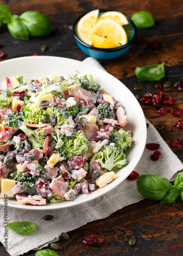 Healthy Homemade Broccoli Salad with bacon, red onion, cranberries, pumpkin seeds and cheese