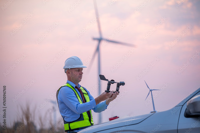 Engineers using meteorological and instrument collect data laptop to measure the wind speed, temperature ,humidity and solar cell system on wind turbine station is sustainable energy concept.