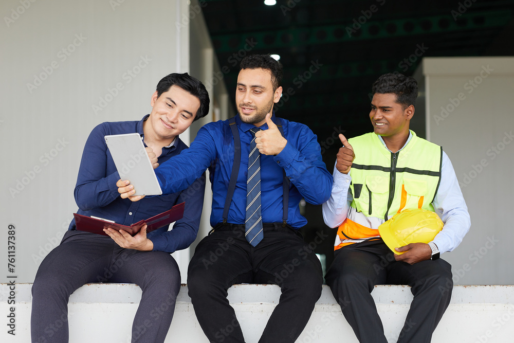 businessman and worker taking a break and video calling on tablet in the factory