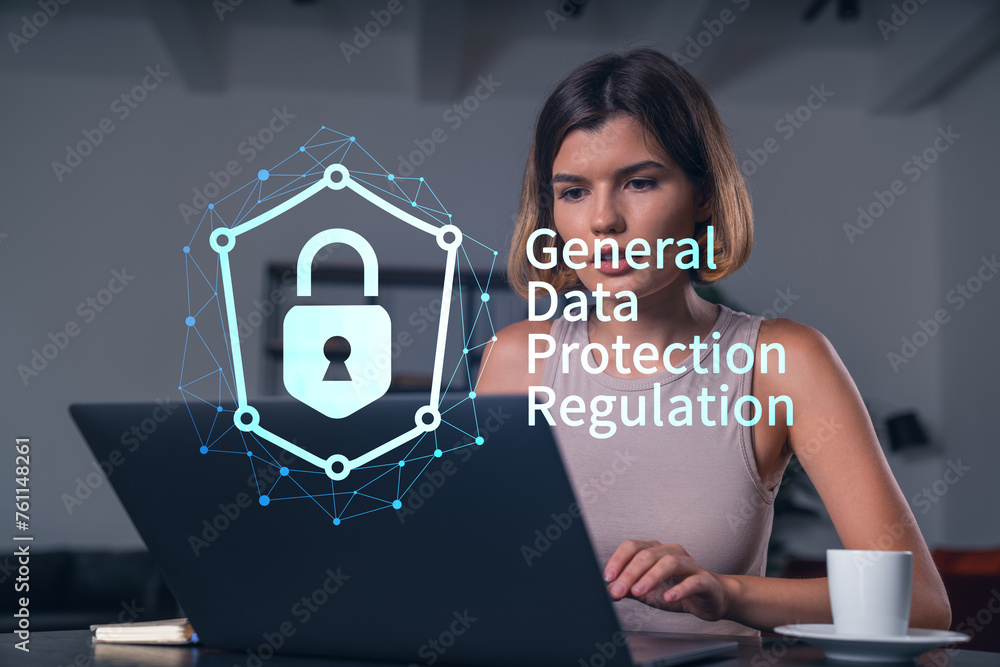 Thoughtful businesswoman in casual wear typing on laptop at office workplace with coffee cup. Concept of distant work, business, internet surfing, information technology. Data security hologram