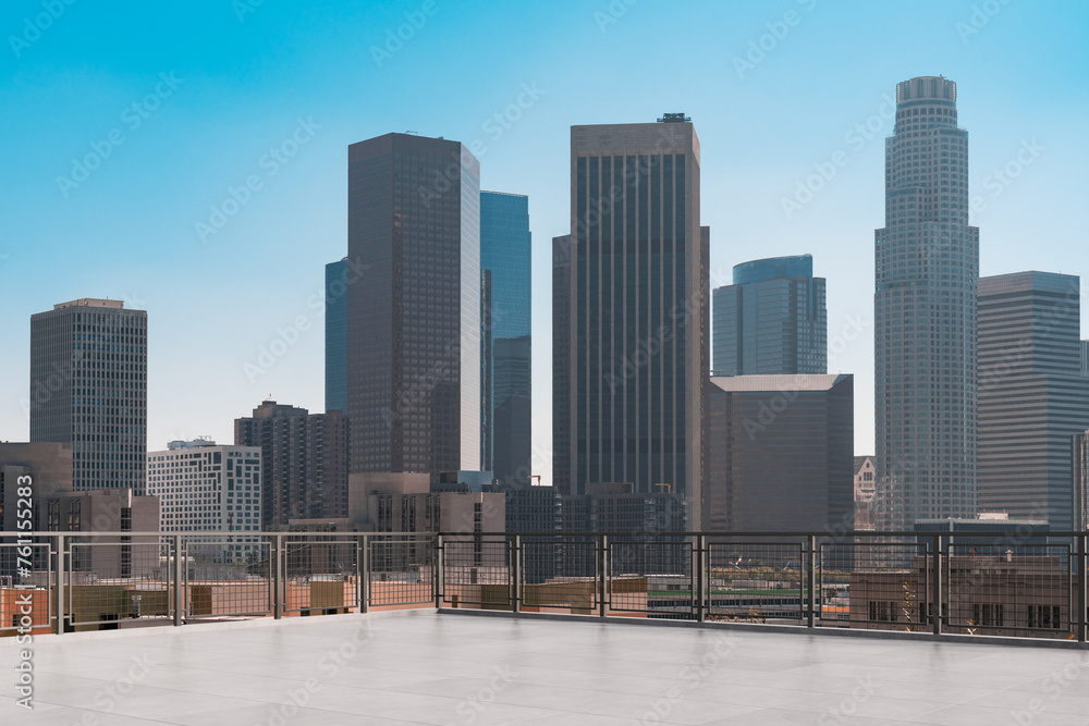 Skyscrapers Cityscape Downtown, Los Angeles Skyline Buildings. Beautiful Real Estate. Day time. Empty rooftop View. Success concept.