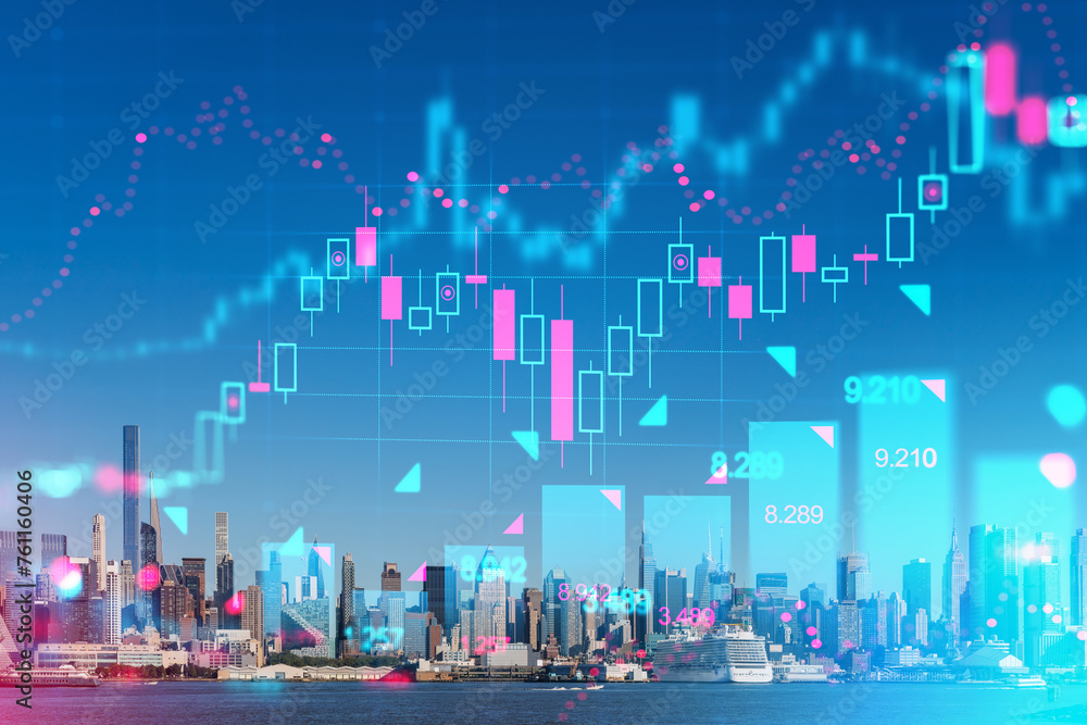 Manhattan skyline with holographic stock market graphs overlay. Digital graphic, cityscape background. Finance and trading concept. Double exposure