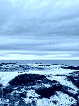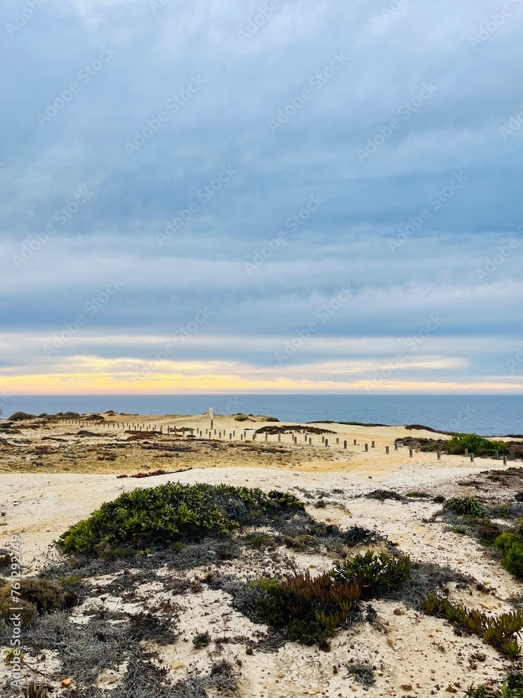 Cloudy sunset at the ocean, rocky ocean coast, sunset ocean horizon, way to the ocean