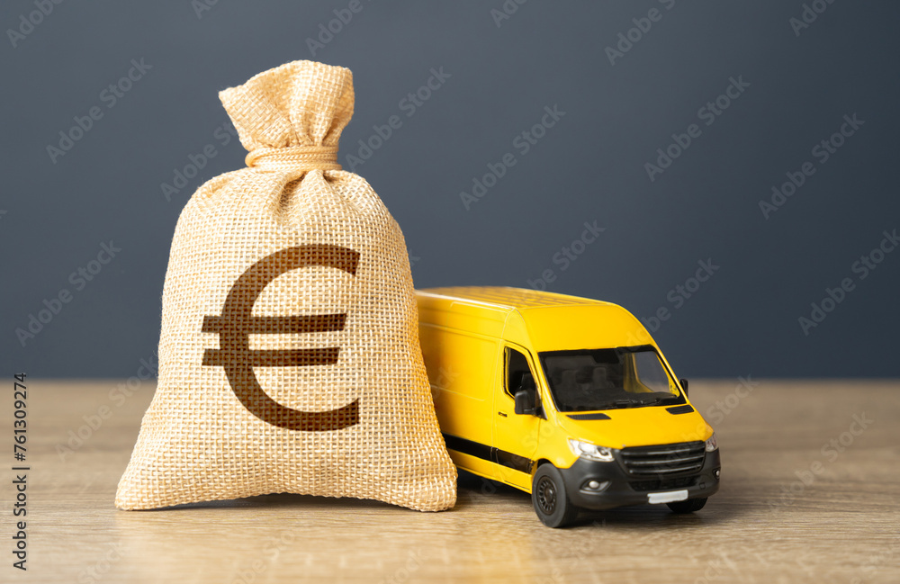 Delivery van and euro money bag. Invest in electric and autonomous vehicles. Freight transportation. Logistics industry, driver shortages. Supply chain resilience.
