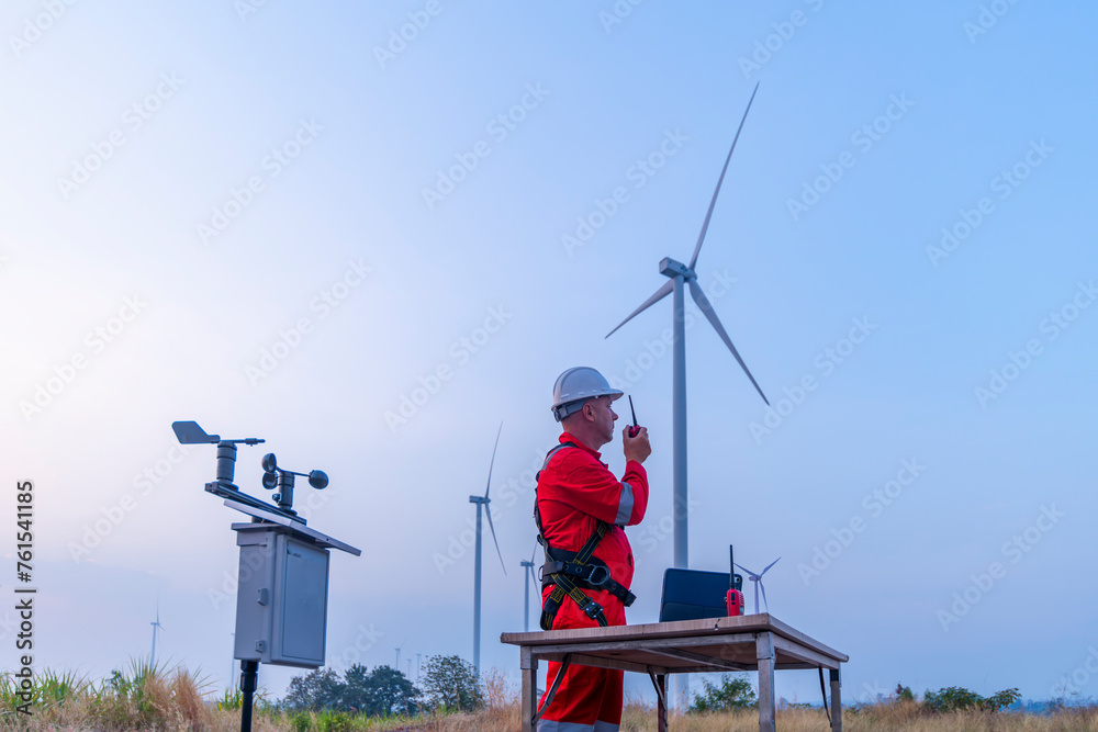Engineers turbine windmill work in turbine farms rotation resource from windmill turbine model and meteorological collect data to measure the wind force meter is ecology energy concept.