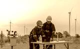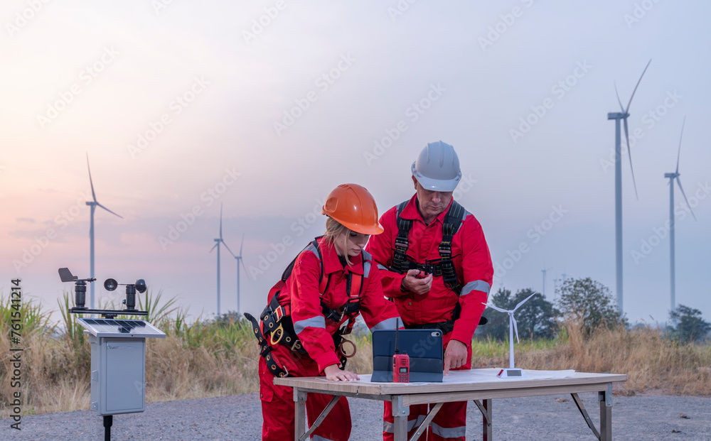 Engineers turbine windmill work in turbine farms rotation resource from windmill turbine model collect data to measure the wind force meter is ecology energy concept.