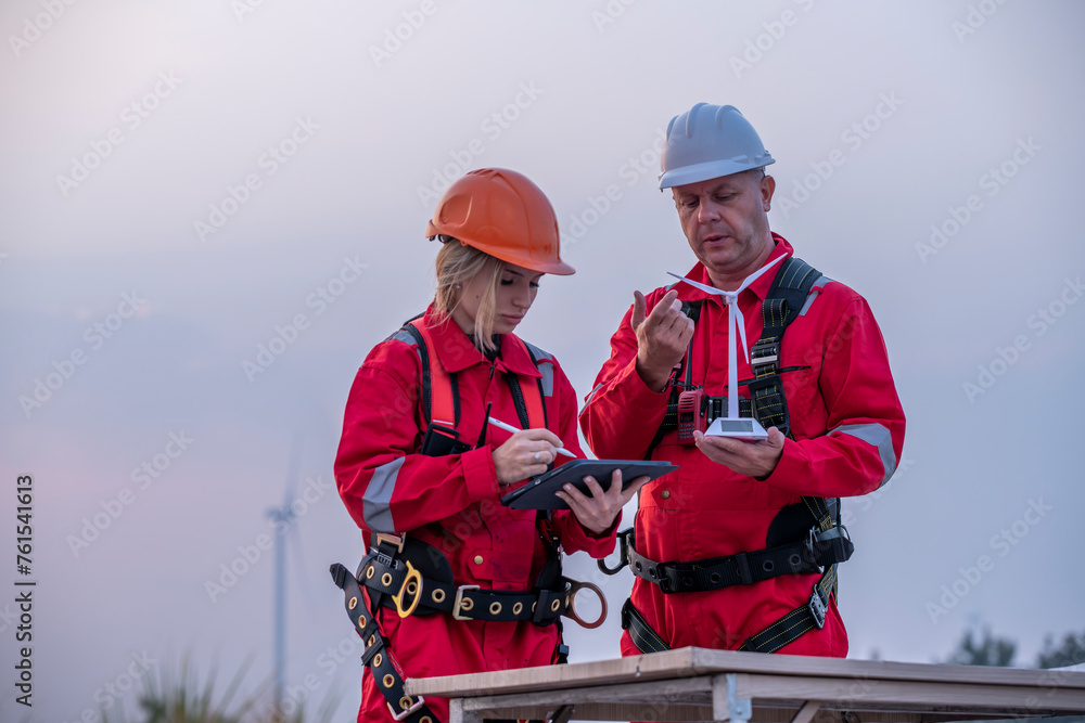 Engineers turbine windmill work in turbine farms rotation resource from windmill turbine model collect data to measure the wind force meter is ecology energy concept.
