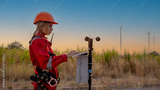 Engineers turbine windmill work in turbine farms rotation resource from windmill turbine model and meteorological collect data to measure the wind force meter is ecology energy concept.