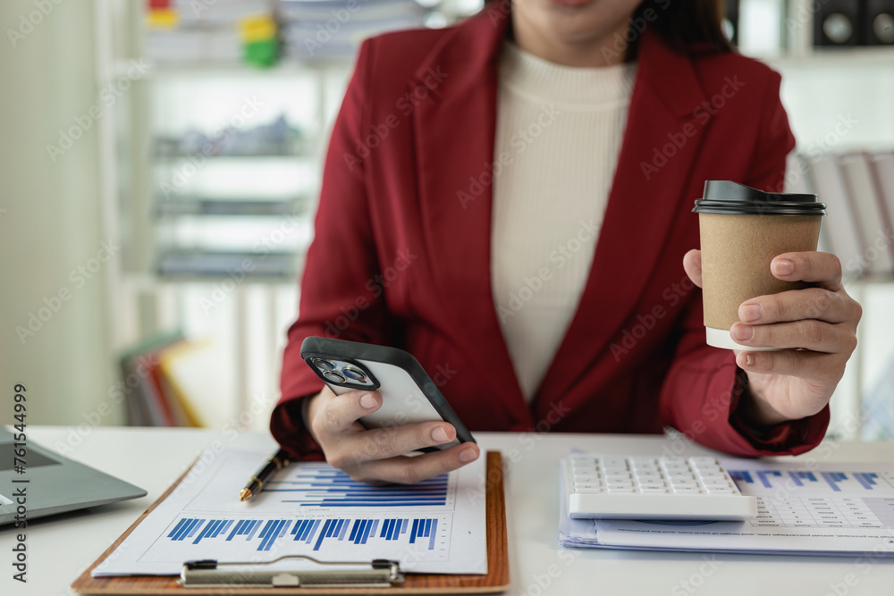 Attractive Asian accountant in suit calculating cash bill of audit and balance sheet working on quarterly report using laptop thinking about project plan. Analyze marketing or financial data online